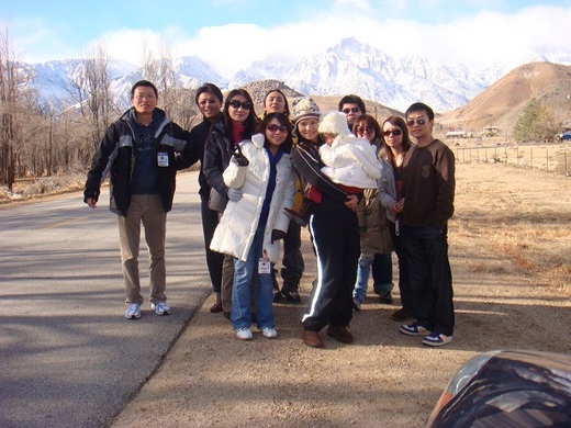 三十一日,清晨八時許一干人等,計五男五女與一小女孩兒Josephine,從好得路(hotel)出發。路旁的山巒早已白頭,接近滑雪勝地猛獁湖(Mammoth Lakes),主力車隊裝上了雪鍊,四輪傳動的Bruce則無此顧慮,這車現在接上了Kiwi與漪雯,有了五個成員。