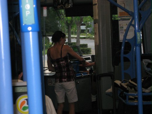 圖片是在黃金海岸Robina 的公車上拍的,這位小姐正在付錢買票,右邊椅子上是她剛到 Town Center 買的一大堆東西。公車原本要開了,不等她招手,司機便主動的停下來讓她上車,讓她放好東西後才來買票。車上的乘客也悠閒的等著,多等她二分鐘讓她上車,她就不需花二十分鐘等下一班車。