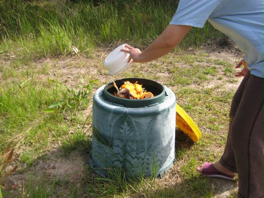 自製有機肥料時備有兩個塑膠桶,無法食用的生蔬菜或果皮,放在桶內讓它發酵。