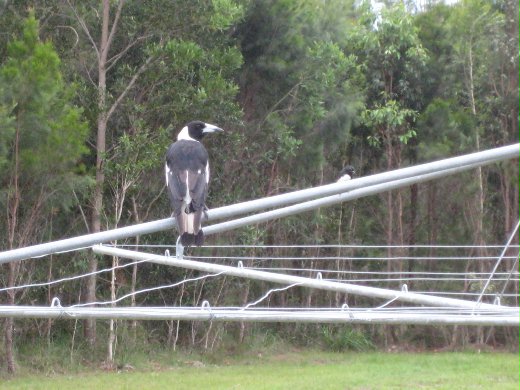 在這種環境生活,似乎與大自然融為一體。圖中的袋鼠是我在朋友家陽台跟牠揮手,牠好像瞭解似的站在那等我拍照。鳥兒(Australian Megpie) 正悠閒的站在曬衣架上。