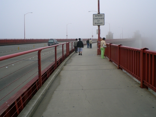 我索性走在橋上,在霧中來回一趟,雖然九月舊金山微涼的霧氣讓我看不見美景,但能見到如此霧氣中的金門橋,雖悲慘卻難得,我記得那天清晨搭車返回飯店時,就聽到IPod中的這首:我的心遺留在舊金山。在晨風中我有些醒了,覺得心就像被風吹成蛋捲冰淇淋,在涼爽的晨風中急速融化。