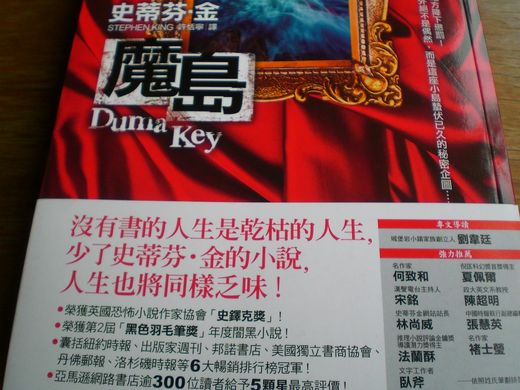 皇冠叢書本月推出史蒂芬.金最新得獎著作「魔島」,依然由我掛名推薦此書,這本書去年得獎無數,亦將開拍成電影,中文版上市我想應該會造成轟動。畢竟金爺是位非常會說故事的人,尤其封面設計聽說金爺美國經紀公司非常滿意台灣設計版本,全紅背景更妝點出此書共厚688頁「魔島」之奇幻感。