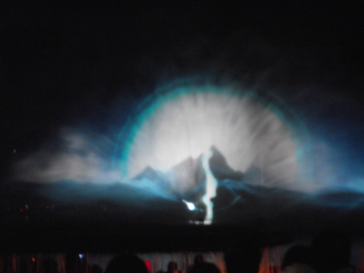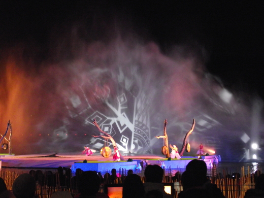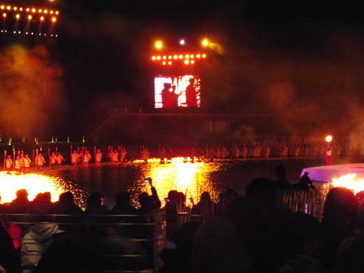 演出分成四幕,從仰望星空、人間煙火到天人合一及泰平禮讚,每段都有豐富創意及特色,感覺節目設計者的用心,似乎想擺脫過去慶典節目內容的刻板。現場感覺相當美幻,數百位演員冒著寒冷的台北河畔下水賣力演出讓人感動。這表演形態讓我想起張藝謀的印象西湖,然而概念上卻發展出台灣的跨海、荷蘭船隻入港及原民文化最後煙火風起雲湧。昨晚節目設計上較偏向原住民的文化特色展演,也許是強調台灣原民的精神盼望大家飲水思源。