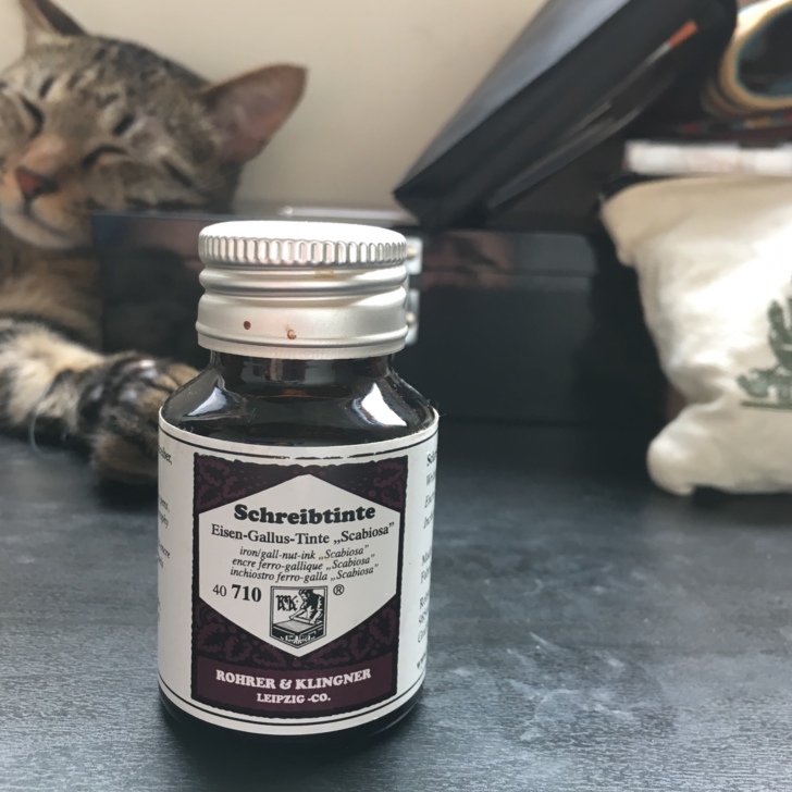 又稱鐵膽墨水。蟲癭是寄生在職務上的瘤狀物,將之磨碎後混入鐵屑,加入紅酒、醋防腐,再加進阿拉伯膠增加黏度,相當適合羽毛筆使用。寫出來的字,時間越久顏色會越深。我就有一罐德國Rohrer & Klingner的埃及玫瑰Scabiosa,特色防水,原本寫出來是紫色,時間久了再看,會變成近黑色。