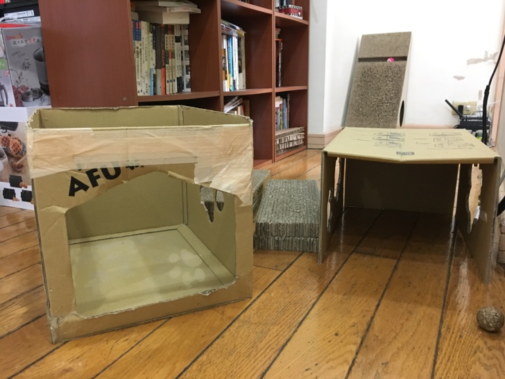 (慘不忍睹的補丁貓屋.....,右邊受損最嚴重,已經斷掉,無法支撐上層的貓抓板,