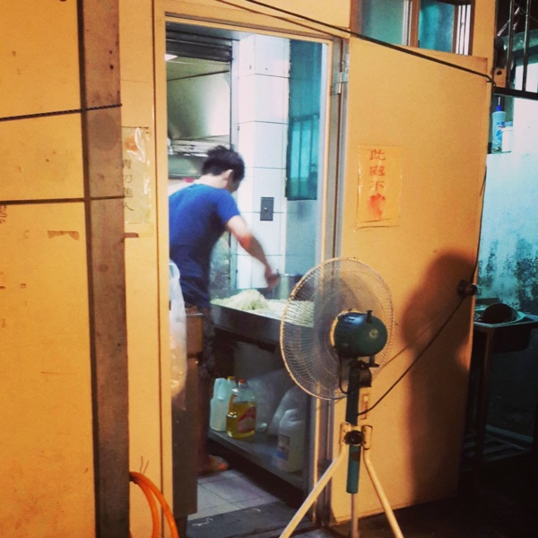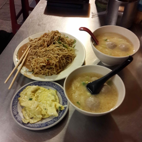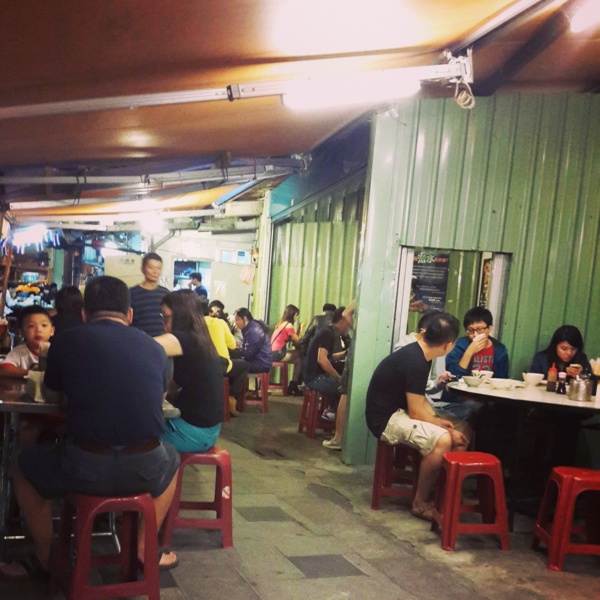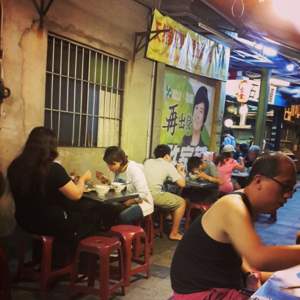 說他是大排檔,因為他就在轉角路邊,挨著老平房、鐵皮屋的牆壁外,架好棚架、掛著鵝黃色燈泡,擺上一個個桌椅筷子醬油,坐在鐵窗下吃麵喝湯,不曉得屋內人有沒有聞到香味。簡陋可就是有股熟悉的溫暖。