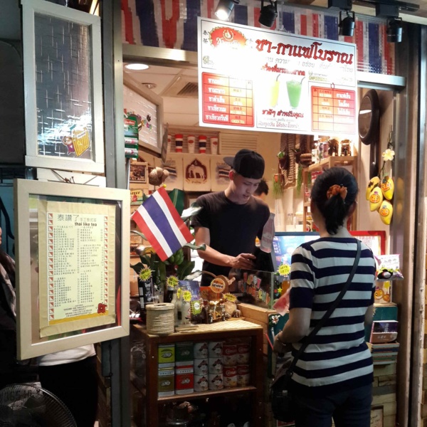 就在涼麵屋子旁,隔出一間小小的奶茶攤,兩個高帥小帥哥在裡頭忙碌著。這裡賣的是泰式奶茶,攤檔佈置得很有泰式風味。大小木櫃當成結帳櫃台,擺滿各式從泰國帶回來的食品,再高掛泰文價目表招牌,要不是旁邊有人在大口吃涼麵,還真以為來到泰國。當然離開前,我不會忘記帶一杯泰式奶茶回家,不只奶茶,各種泰式口味檸檬茶、紅茶、水果茶等等都有,要一樣樣都喝過,可得花好一段時間。