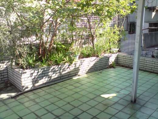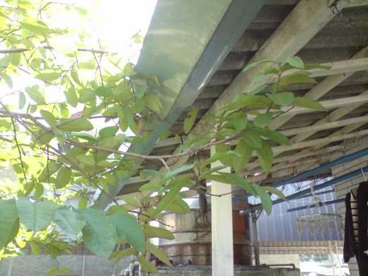 最外頭是個花圃,種著葉子又厚、邊緣有刺的不知名植物,還有一株一樣叫不出名字的小樹;枝葉細細長長的,應該是相當健康的關係,樹枝快要垂到花圃外的地上了;當然也有雜草,鮮綠顏色很亮眼。陽台有遮雨棚,可以遮風避雨。遮雨棚下懸吊著三根長竹竿,用來晾曬從一旁洗衣機洗好的衣服。接著就是我的鞋架、放衣架的箱子。
