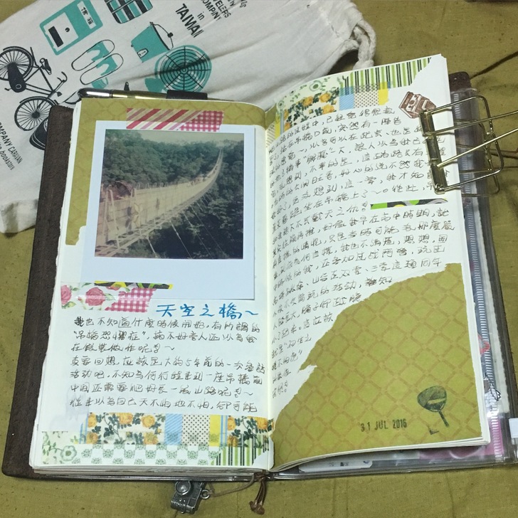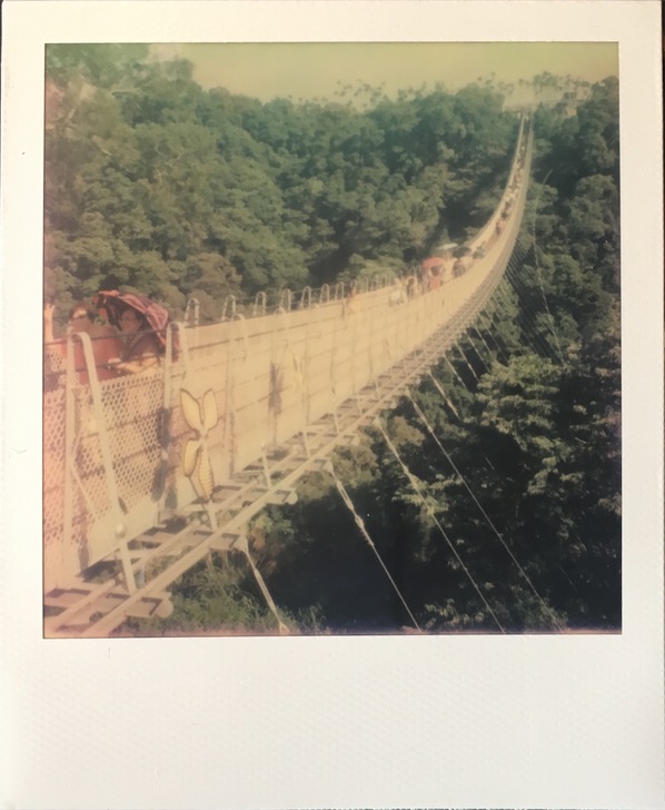 幸好團員必須折返走回來,於是我可以輕鬆的站在入口,也是出口的地方等著,順便充當起其他遊客的"幫忙拍照員",自己也拿出Polaroid sx70拍下一張照片,以示到此一遊。看著團員有的臉上還充滿興奮,有的則是臉色發白的各式模樣,忽然覺得,人生好像無時無刻都在走吊橋一樣。一件事就出現一座橋,自己踏出的每一步都得小心翼翼,儘量不晃動、快步走完,還得顧慮到後頭、前方的人,千萬別因為自己的一時大意、不小心,讓別人走的不開心,甚至出意外,大家一起平平安安走完。這是同在一條"橋"上的概念。