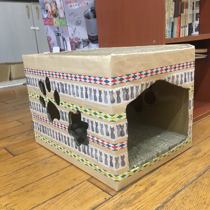 (慘不忍睹的補丁貓屋.....,右邊受損最嚴重,已經斷掉,無法支撐上層的貓抓板, 還好主架構沒快,貓抓板也不用換。) 不知是不是我家的喵太勇壯,貓屋買了一年就快要解體了!屋門上方快掉下來,暫時用紙膠帶...