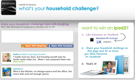 Kenmore是美國家電的一個品牌,最近他們在知名的社群部落格BlogFrog上辦Household Challenge(家事挑戰),只要在網站上留下你覺得家中最困擾的事情,就有機會贏得iPad2。 ...