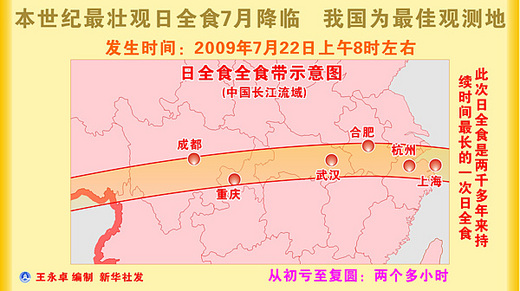 本世紀最重要的一次日全食將于2009年7月22日上午8時左右發生。作為日全食的最佳觀測地,中國屆時將舉行“2009國際天文年日全食科學觀測和科普活動周”活動。