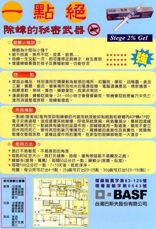 該產品的有效成份愛美松(hydramethylnon),商品名稱為一點絕,在台灣登記的劑型為 2% 膠餌,殺蟑效果極佳,滅殺率極高。