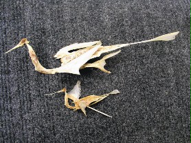 小鳥的骨骼標本?錯了,這是釣友用白帶魚頭骨併湊成的「仙鶴」。帶魚的顱骨用做小鳥的本體,鰓蓋骨用做翅膀,鰓蓋下的顎骨用做(孛頁)子,頷部的針狀骨用做尾巴,全部利用體骼上原有的關節或窪孔,就可拼成,整個鳥形骨架不用一點膠水就可站起。