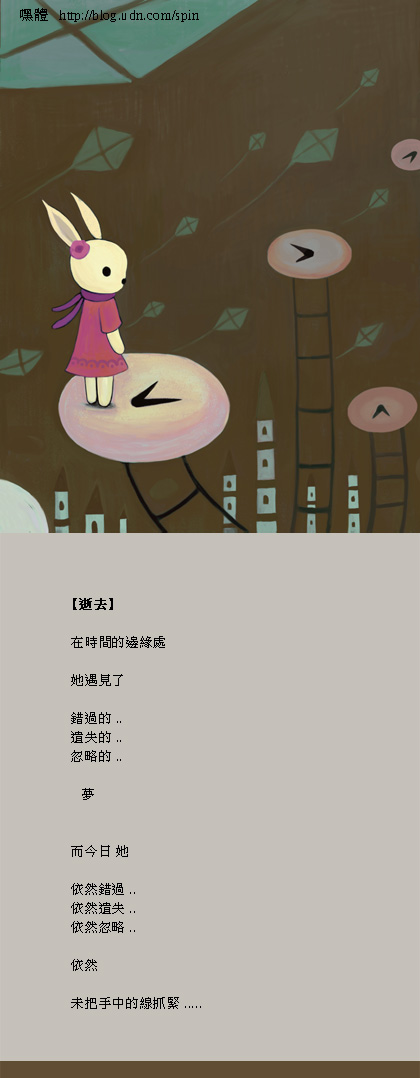 加油!~~我也是愛創作的,也有夢,現實環境卻也是有障礙,只好抓緊青春的尾巴,現在雖然跨不上去,但也不會輕易讓它走。 - 1樓. 夜函2009/11/20 09:46ㄏㄏ
