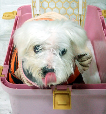一月21日這天中午,我帶著牠坐飛機返鄉,事先詢問過醫生了,心臟能夠承受大氣壓力,坐飛機沒問題。但就在到家鄉的機場時,等待行李時,忽然有名工作人員大聲呼喚了我的名字,我一過去,他就直接說了:你的狗只剩半條命了。然後就把狗籠交給我。我一看,發發現白白躺在裡面一動也不動,昏倒了,舌頭是白色的,且乾燥,身體則有些過分的暖。然後工作人員要我把白白抱出籠外,說要拍照作記錄。拍完,又對我說了一句話:你最好要有心理準備,這裡的醫療是比較落後的。我聽了很震驚,在他們眼裡,白白是沒機會了嗎?我不敢答話,我怕白白聽了會以為主人要放棄牠了。(雖然牠聽不到)