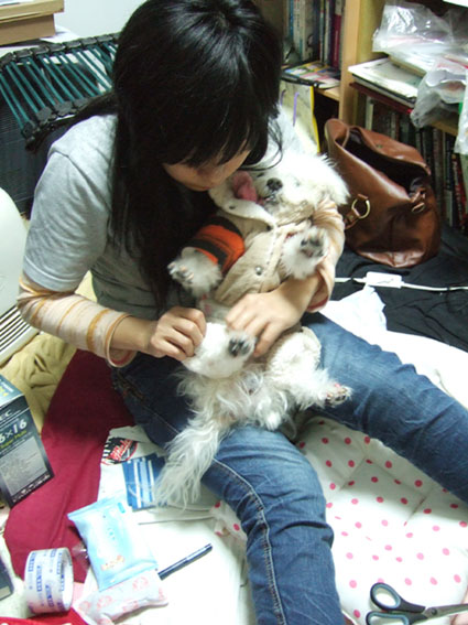 圖1是我幫白白穿衣服,換暖暖包,所以地上一堆工具。圖2是白白表情特寫,難得牠出現這麼迷濛的眼神,而且好像一隻小熊,真的好可愛。