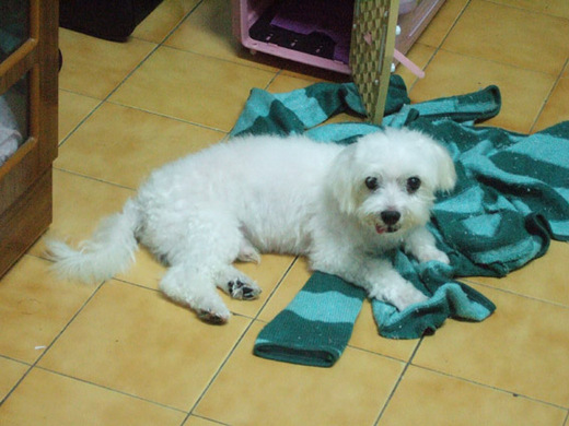 我記得當天我好驚訝,以前在家鄉時,家裡曾養過許多土狗,我對狗的觸覺已經有習慣性的印象。而那天見到你,直覺喚你小白,你也很開心的回頭,並在我身邊蹦蹦跳跳得好有活力,像隻勁量小兔一樣。然後我摸了你一下你的背,這一摸,我有觸電的感覺。你背上的毛雖然有些髒有些小打結,但好柔軟阿,我從來沒有過這麼美妙的觸覺經驗。然後我把你抱起來,不知為何的,你就一直往上竄,爬到我的肩上,甚至覺得你都想爬到我的頭上去,要不是不好踩,你肯定會這麼做的對吧?然後那天,我把你全身上下都打量一遍,就好想把你占為己有,畢竟你實在是很難讓人不愛阿,雖然缺點就是你有點野。