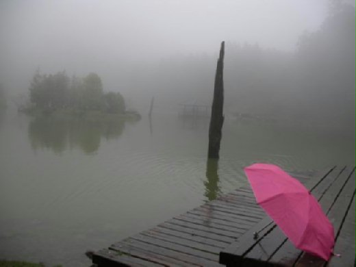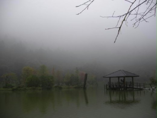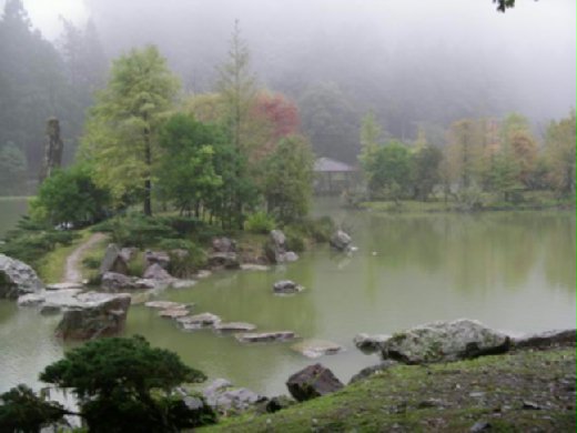 霧時濃時散,明池湖中間的小島、臨水庭、水中的枯木,像是劇場中布幕的開闔,隨著霧的移動而時隱實現,湖裡的黑天鵝、鴛鴦及魚們,早就不懼怕人,靠向岸邊爭著要得取一些餅乾、碎麵包。