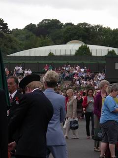 整個溫布頓網球場,有ㄧ個主球場(大約就是電視上可以看到的那個),還有另外兩個稍為小一點的,ㄧ樣有看台區,然後再數10個小網球場,加上一些環繞球場的大型建築,裡面提供餐廳、商店、休息區…等,以及Tennis Museum,整個區域用高高的圍牆擋起來,除了幾個gates可以大約瞄見裡頭的ㄧ角之外,完全是個只能聞其聲不能見其影的世界。