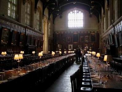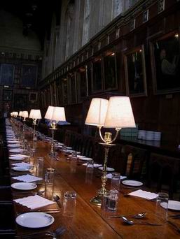 ㄧ進到這間餐廳,我必須需說:「這真是太棒了!!」很古典但又展現出一種裝飾的很低調的奢華感,三大排長長的餐桌,擺設了古典的桌燈以及餐具,第一感覺是「這跟電影裡真的很像,是拍完後故意保留的場景吧」,因為本人壓根不相信這真的是學生餐廳,而且原貌就長這樣,但是ㄧ踏進去就聞到烤麵包的香味,這 … 這真的是學生餐廳耶,真是豪華的令人想哭(太令人忌妒了),我們學校只有廉價的方形桌椅,這真是天堂跟地獄的差別阿 … 。最前方是ㄧ排師長席,牆上掛滿了歷屆校長或畢業後變的很有名的校友,兩旁的火爐,可以在愛麗絲故事裡發現他的蹤跡(哈利應該也有用到吧,灑個 呼嚕粉 ,從火爐消失到另一個地方,是叫做顯影術吧?),餐桌上方的窗花,其中一個就是有名的愛莉絲之窗(照例,我的窗花癡呆症讓我整個 hall 巡了多次,仍舊找不到,最後還是朋友指給我看才終於看懂ㄌㄟ)。
