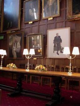 轉出教堂的院子再進到另一棟建築 Dining Hal l ,這邊可真是人最多的地方,因為愛麗絲故事的啟發靈感,及哈利波特的學院餐廳場景都在這,ㄧ轉進這個建築就看到那電影裡熟悉的樓梯,對啦 … 沒錯啦 … 這就是哈利要回寢室的樓梯,所以上樓後應該會看到胖女士的畫像囉!還有天花板上的吊燈,天ㄚ!!沒錯就是他,真是熟悉的 … ,ㄧ上樓沒看到胖女士畫像,不過有老女士的導覽員,正領著一群參觀完畢要離去的團員,這真是太好啦。
