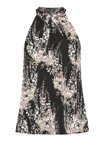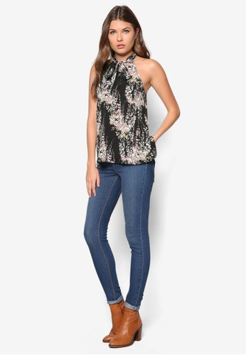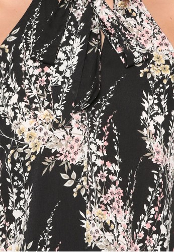 Miss Selfridge 的繞脖削肩印花上衣,繞脖V領配以繫帶設計,有削肩袖口,優雅印花和輕薄材質,是春夏俏麗必備時裝。