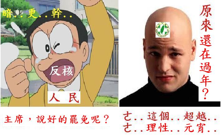 不久前民進黨說要與2014大選一起舉辦反核公投,沒想到反核團體竟然強烈反對?理由是也有泛藍選民支持反核?反核應該超越藍綠,不希望與選舉綁在一起泛政治化?問題核四本來就是個政治問題,政治問題不以政治手段解決,難道上上街頭炒炒新聞,就能達到反核的目的?更好笑的是泛藍選民就是核四的最大元兇,沒有他們選出馬英九,今天又何必耗費如此巨大的社會成本,還敲不醒這個Bumbler?如果真正反核,就該歡迎任何團體以任何手段共襄盛舉,反核又不是反核團體的專利,他們又憑什麼反對其他團體提出的反制方法?