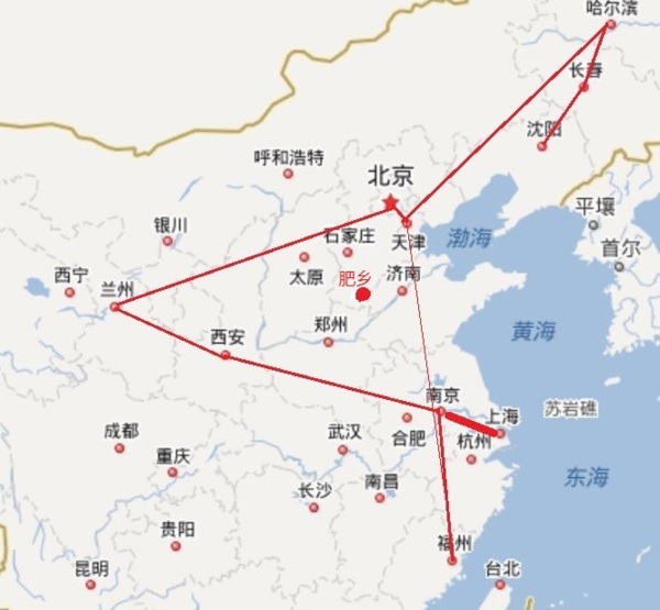 肥鄉縣是中間那一點。哈到沈的彎鉤惟妙惟肖,與南京-上海共同形成丹(鼎)的兩個支腳。我似乎看見熊熊柴火之上的鼎中有丹藥在沸騰的湯汁裡上下沉浮。圖中南京到上海那一段(紅色粗線),即第一次飛行中黃醒來後坐火車過去的。瀋陽到福州(紅色細線)是我突破性的推理:飛人背著黃先是折線到達天津上空後經濟南,橫穿整個山東和江蘇,經南京到達榕城(福州)~誰規定只能飛直線(即飛越渤海、黃海)?探究此事件的所有人囿於“距離最短”的“直線思維”而無法參透飛人執筆(黃延秋)意在書“丹”的玄機,而只有我“不按常理”(jump out of the box)。而且飛人折線飛行不僅是寫意,這個“丹”還要符合五行相生相剋原理,後面有詳述支持我的觀點。