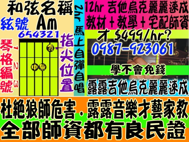 指法教學+刷法教學+唱法教學+間奏SOLO教學+露露音樂流行教材+宅配到府授課=才花$499/hr??太扯了!!比樂器行比YAMAHA更便宜更低價更貼心~居然~還宅配師資到府?少看兩場電影馬上擁有吉他烏克麗麗彈唱才藝~真的太便宜了!!馬上報名請洽0987-923061~3人同行更優惠150元喔!!~學不會不收錢喔!!