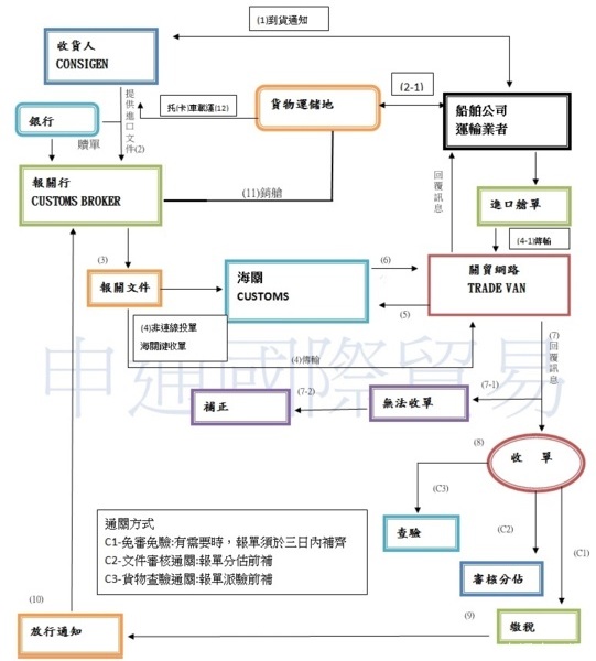 貨件到倉→裝櫃及報關→通關(繳稅)→到港提領→送件上門(安全又迅速)。