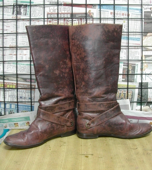 來看看這雙遭受嚴重蹂躪的靴子...皮面嚴重脫色.及局部磨損