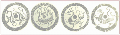 這四個圖紋是古代所謂的四吉祥神獸︰青龍/白虎/朱雀及玄武。原始的圖紋則是出自於 中國 漢代 刻劃於“瓦當”的面上;又稱“四神瓦當”當今留存的原物應該是存放在陝西博物館。紋飾的重點在於細部的刻劃,例如虎毛的斑紋、龍鱗、鳥羽及龜瞉紋路等。中國古代的動物圖案,常見充滿生命律動的結構案,意思是常見動作中的圖案;所以早期有人講東方人是保守的民族,其實並不是,以前我們是相當充滿生命爆發力量的。