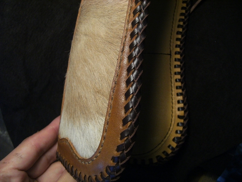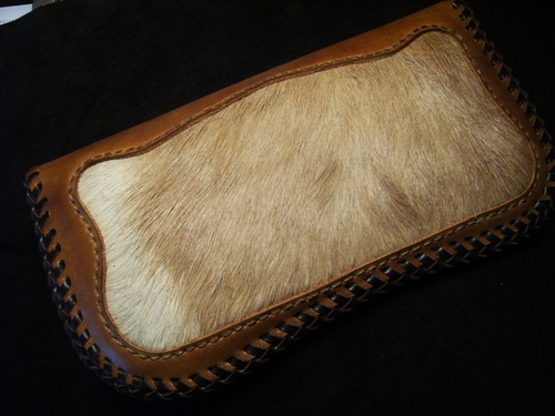 這件的材料總的講起來是全部都是牛皮;從外皮(自己手染)、內部各部夾層、一直到手編縫線都是牛皮革的材質,另外中間的帶毛皮質是進口的羚羊毛皮(非保育)。其實手工皮革的作品在製程是不用講太多的,不同的施作人功力不同,也有不同的角度和想法, 因而在各種搭配和線條的刻劃會有所不同。