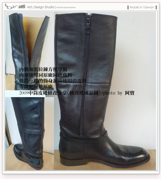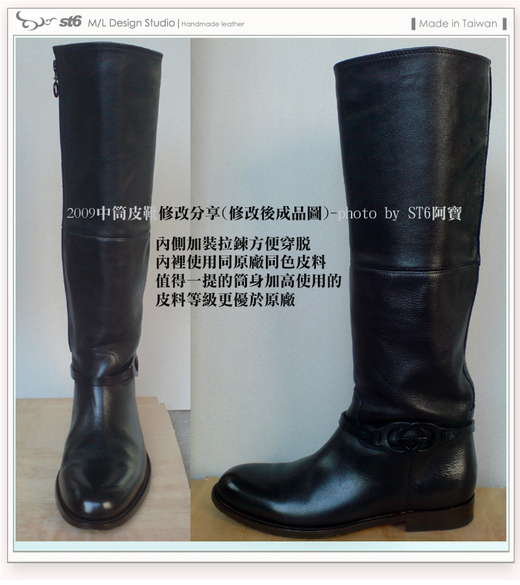 【12/15補成品圖】修改中為了達成和原物質感的一致性,我們選用了等級更高的同色皮質,包含外筒身加高用黑色牛面皮及駝色Nappa牛面皮(內裡)。加高筒身後去除原廠提耳,內側加裝拉鍊,最後進行細部修飾及基礎保養美化成品。原本打算缷除飾條處的作法,最後在內部討論時因特殊技術問題而改為直接加長;基本有幾個理由︰對於客戶來講最經濟最省;二是基於尊重並能夠維持原廠的作品設計概念.....以上與您分享...至於有朋友說為何不用之前作法...ha~阿寶認為...您想想動到大版型..味道有可能會跑位..那麼站在客戶立場..當初幹嚒花大錢買這雙精緻素雅的G牌高級皮靴?? 修改的主角是靴子和她的主人...而我們僅算是專業的配角...很簡單不是嗎