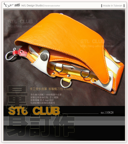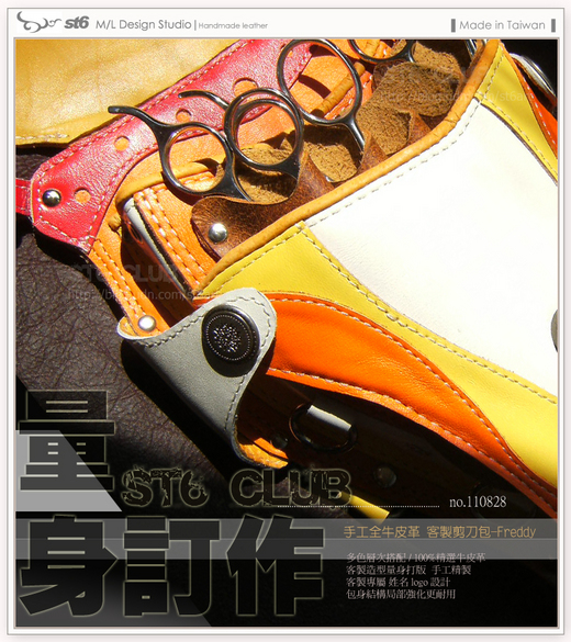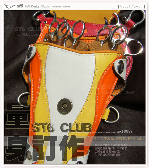 這是件客戶提供概念需求 ~相當多色搭配的客製款剪刀包,功能性該有的都具備不多談,該強化的結構部份必作處理是基本的,所以重心是出在色彩搭配,而且她還有二條多色搭配的皮背帶!!!