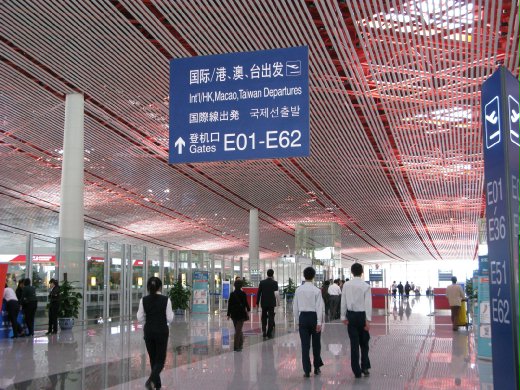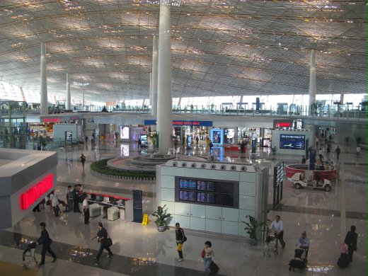 就像經濟突飛猛進的中國其他地方,富麗堂皇的新機場內還是見到穿著吊兒郎當的工作人員,以及掛著土氣紅錦緞的服務員。 機場員工需要的時候找不到,沒有需要的時候卻是熱心提供服務。 有的對白種人熱心但是對同胞卻愛理不理。 商務候機室的裝潢比桃園機場的摩登舒適數倍,但是新地毯已經捲毛,處處可見到跌落的食物碎屑,用餐時間卻也只可以找到一些粗糙的飯食與泡麵,沒有筷子只有塑膠刀叉,找不到玻璃杯的香港人抱怨:「你們的貝為什麼怎麼遠?」