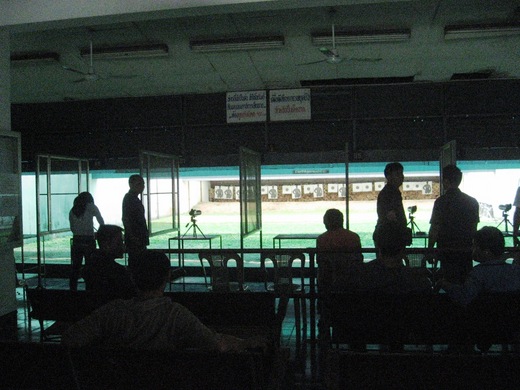 這次來曼谷還有一個目的 – 這裡的軍用射擊場。 亞洲除了菲律賓和泰國以外也沒有甚麼地方可以讓遊客隨意玩槍 。 負責接待的年輕人英文講得不怎麼樣,也算是我們的教練。 手槍拿出來是捷克製 9mm (與第二次世界大戰德軍用的 Luger 手槍類似)和 45 口徑手槍( .45 ACP ),在美國都可以算是古董了。 問他有沒有 Beretta 只換回一陣搖頭。 子彈得一顆顆塞入彈夾,一次只能放入五顆。 但是 這種全機械的手槍又比較真實,現代自動手槍就和玩電玩沒甚麼兩樣,霹靂啪啦就可以射光十五粒子彈的彈夾。 這裡只能乖乖的一顆一顆來,有的時候還會跳彈卡槍。 三千泰銖五十顆子彈, 9mm 和 .45 各一半。 真槍射擊是比電玩更真實的發洩方式。 教練觀察了一段時間問我朋友為什麼只瞄人形靶的腦袋? 他很快地回答,「我在思念我的前妻。」