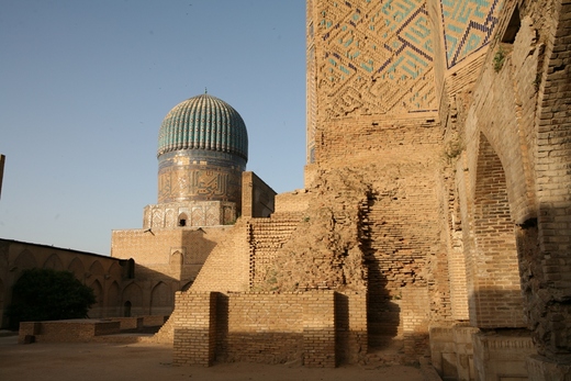 撒爾馬罕是古絲路的重要城市之一,舊城在成吉思汗攻花剌子模時被摧毀,廢墟自今依然存在。 屠城存活下來的人在廢墟隔壁重建新城。 出生在 Shakhrisabz 的帖木兒建國時又選擇鄰近的撒爾馬罕為帝國首都,帖木兒的孫子 Ulugbek 建的 Registan 是現今烏茲別克境內最雄偉的回教建築。 Registan 讓我想到伊斯法罕的伊瑪目廣場,只是不論 比例或者精緻都比後者差 有一段距離。 再加上撒爾馬罕又多地震,數百年後幾個高大的宣禮塔都是歪歪斜斜。 其中一塔警察為了賺外快開放遊客攀登,傾斜的塔看起來有點危險,不過彼得還是堅持付了 3000 sums (約 70 台幣) 爬上去照相。