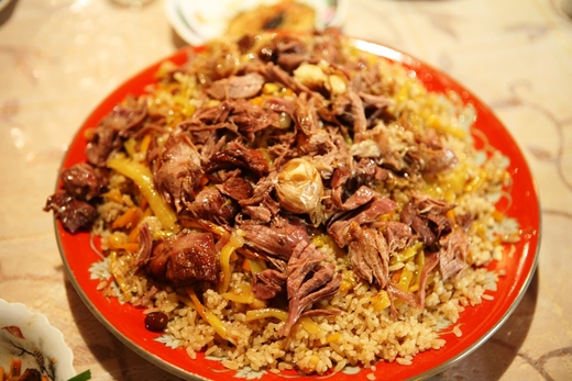 烏茲別克雖然百分之八十幾是回教徒,但是早餐桌上就有豬肉香腸,午餐桌上就有專門喝伏特加的小玻璃杯。 我們有次吃飯叫了一份烤豬肉串,還小心翼翼地問 Batir 在不在意? 他只是聳了聳肩,笑說烏茲別克人偷吃豬肉時稱之為「白羊」,這和中國西北部與回族雜居的漢人稱豬肉為「大肉」有點異曲同工。 Batir 甚至說他的父親曾經在俄國當兵時被迫吃豬肉,不是誰強迫,只是不吃就沒有其他東西吃。 不過最好吃的還是本地的 Plov ,也就是類似新疆手抓飯,略油的米飯伴大蒜、南瓜、胡蘿蔔絲,上面鋪著燉爛的羊肉,比十多年前在新疆吃的美味多了。 另外本地有一種烤肉串是牛肉條外包著白白的羊油,烤好之後羊油滲入牛肉,格外鮮美!