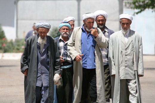 最後一天開車到 帖木兒出 生地 Shakhrisabz 一遊。 與 撒爾馬罕一樣,這個小城已被登記為聯合國世界文化遺產。 市中心有一座巨大的帖木兒銅像,可能是個好日子,幾對穿著西式婚服的新人在銅像下照相。 這裡有帖木兒由印度擄來的工匠幫他建築的 Ak-Saray Palace ( 夏宮 ) ,我們去的那一天氣溫至少四十一二度,我無法想像為什麼要在這種地方蓋一個「夏」宮? Shakhrisabz 是一個滿活躍的小城,造訪那天正好是星期五,不像其他回教地方,這裡的清真寺歡迎遊客入內參觀做禮拜,包括女性遊客與僅穿短褲的彼得。 做禮拜的老先生都穿著整齊的民族服飾,大方的讓我們照相。