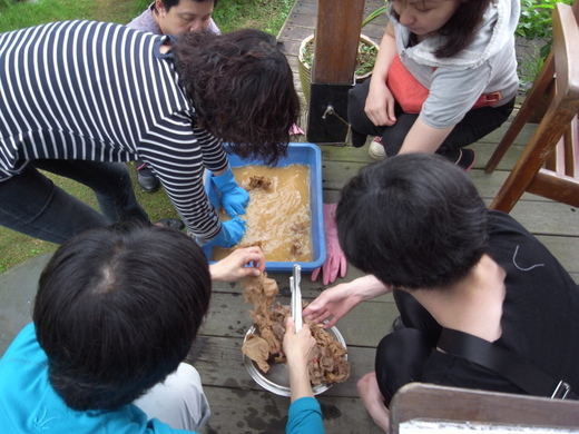 約20分鐘後取出染布(是個人喜愛顏色的深淺調整浸泡時間),並將染不放入石灰水中浸泡後再用清水將染布洗乾淨就可以囉~~