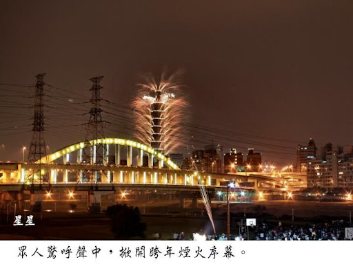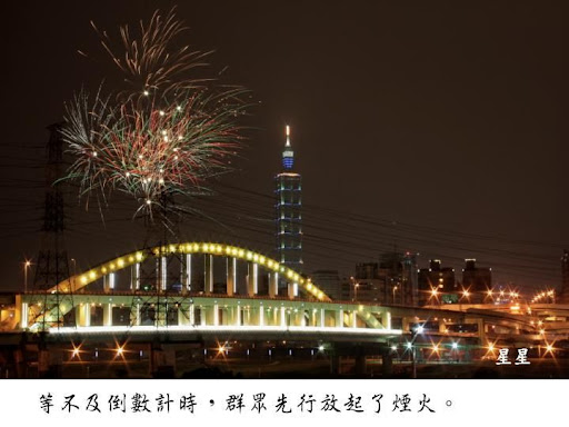 害怕重蹈去年在河濱公園差點得走路回家的窘境,今年放大膽子決定開車前往,自然也因為這樣選擇拍攝的位置不是很理想。雖然如此,今年的跨年煙火拍攝卻給了我很美好的心情。在等待倒數的同時,有位陌生歐吉桑觀眾,彷彿熟識般跟我從煙火聊到了攝影;旁邊的年輕妹妹,開心的跟我有一搭沒一搭的閒聊,結束時還不忘彼此高興大喊:新年快樂。諸如此類的點滴,讓我這顆頂著低溫的孤單心有著暖暖溫度,更讓我深深的相信,未來這一年我會是幸福且自在的!