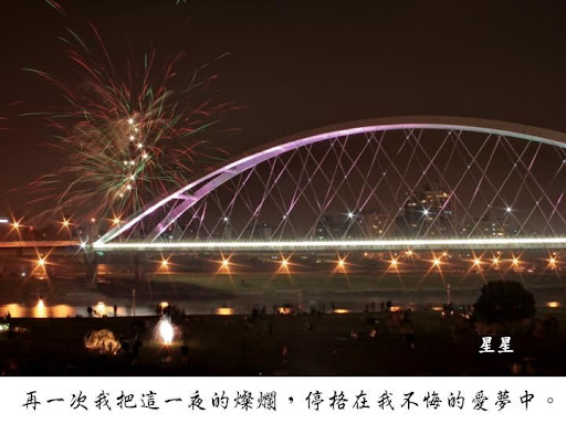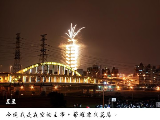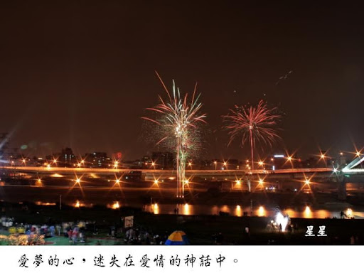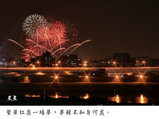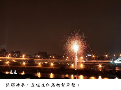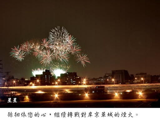 隨著年紀漸增,看煙火也有了不同的心情領會,尤其是進入中年之後,每當有機會看煙火時,除了依舊的滿心喜悅外,更多了些對人生的體會。那一朵朵光亮的煙火從蹦開到結束,就彷彿行走人生旅途中,一次又一次的驚豔回憶在眼前閃掠過,讓心有著重溫的喜悅,當然也有著結束時的黯然。每當煙火表演結束,徘徊在那曾經繁華,如今卻已落的惆悵中時,我總會如此告訴自己:「或許人生的幸福和喜悅,總只能擁有一小小時刻吧!因為這樣所以才會讓人無法忘懷!」。
