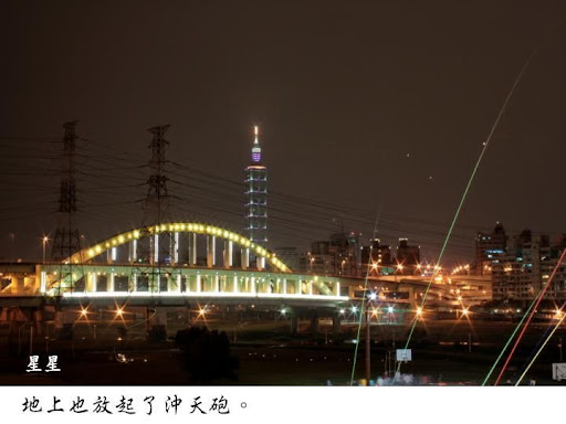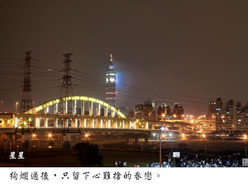 無奈不知是自己的位置距離太遠,還是今年101的煙火施放方式不同,我幾乎無法感受到那份驚豔的絢爛,原本技術就不佳的我可以想見的拍得很爛囉!聽著身邊的遊客紛紛嚷著:「看啊!京華城的煙火可比101漂亮多了!」,可惜的是我來不及轉換方向,只能眼睜睜的看著煙火消失,無法捕捉那瞬間滿天紅色愛心的浪漫畫面啊!