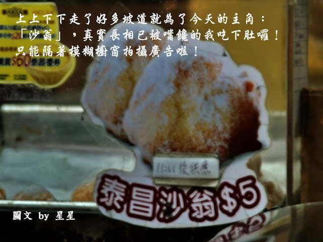一路上上下下,終於走到了「百花街」,看著那不起眼小小的店面,卻排著人龍而且似乎還有觀光客看著導覽介紹,這當然是一定要嚐鮮囉!還好我們來的時間非假日且是上班時間,所以沒有等待多久,那熱騰騰的美食就到手囉!一口咬下「沙翁」皮脆內軟,而且彷彿又會在口中膨脹一般,那個味道有些像是油炸的泡芙和甜甜圈的綜合,但卻感覺不到油炸的油味,總之一句話好吃啦!