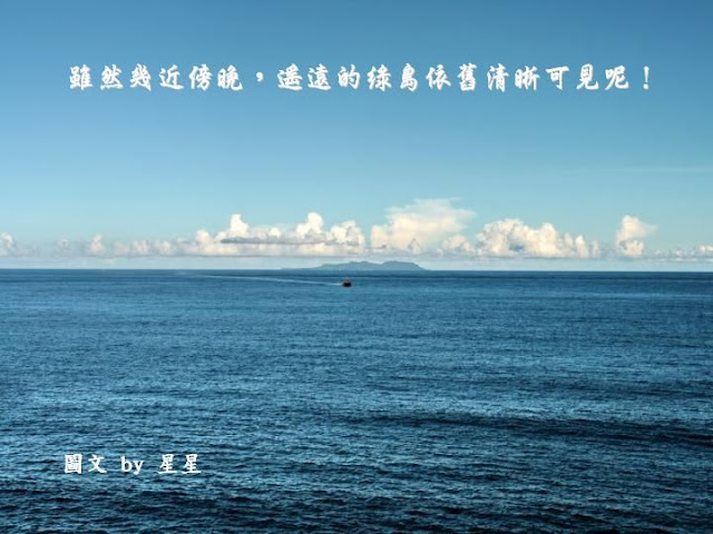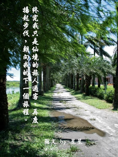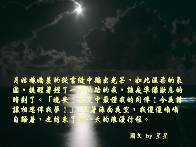 這一趟旅程對我是個很棒的心情旅程,一路上伴隨我的只有山景、海景、動聽的音樂和自我的對話。我的心從出發前夕的沉悶,到返回台北後的欣喜高昂;我的眼從淚水氾濫難歇,到返家後眼底漾滿對人生的知足感恩。經過這樣三天兩夜的放逐流浪,我的心彷彿徹底洗滌過一般,終於真正領會這繁華紅塵夢一場,夢醒也是離去時的真諦。我認真的告訴自己既然最終夢會醒,那何不趁著夢還在的時候,好好展開笑顏、放寬心胸過日子呢?