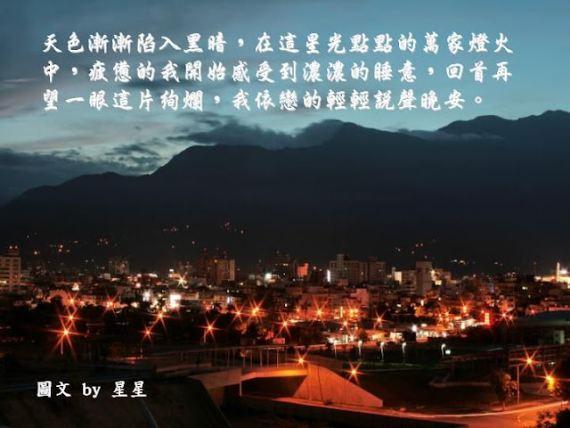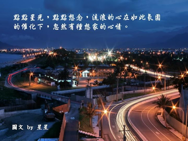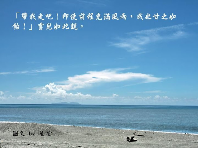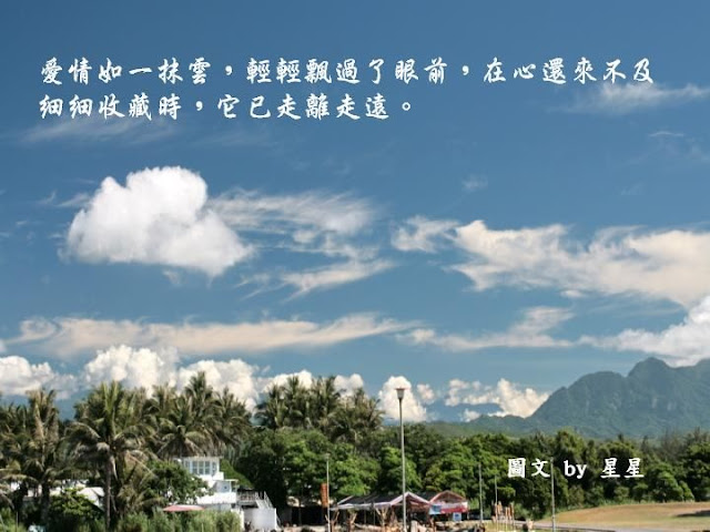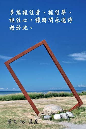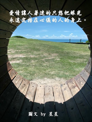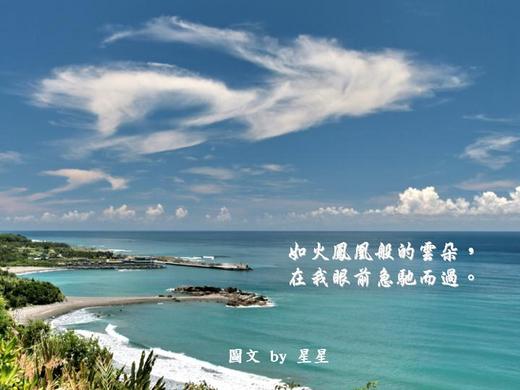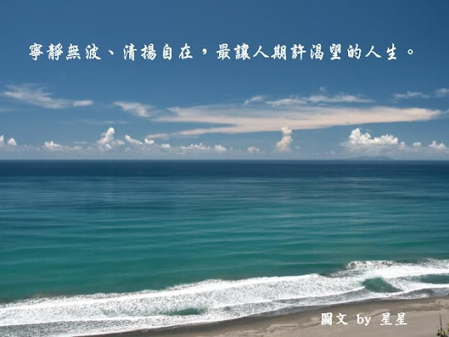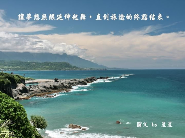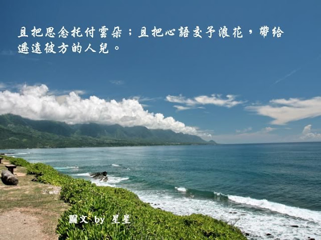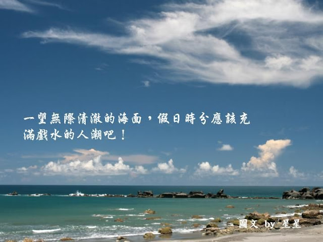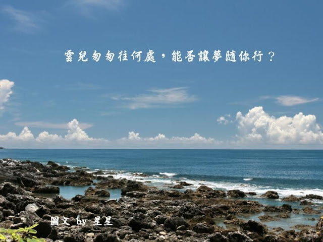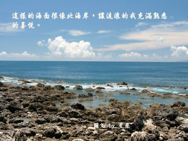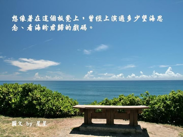 一直喜歡看海、拍海和夢想,人生中的許多點滴似乎都離不開海,這當中有歡笑、有淚水,更有數不清自我跟大海的對話。每每只要望著海面、迎著海風,紛擾的心似找回平靜的歸屬;紛落的淚似找到停歇的能量,所以每次烙印大海時,感覺筆下的文字總充滿著浪漫和溫柔的氣息,彷彿大海深知我心、深解我念吧!