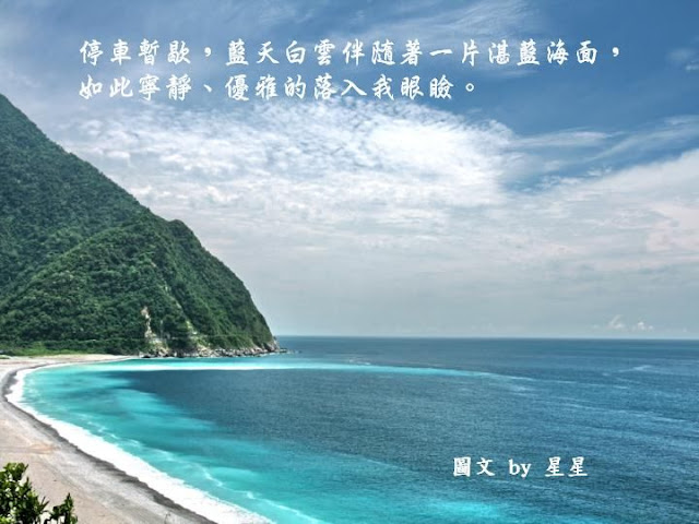 離開了清水斷崖,心漲滿了拍到喜歡照片的喜悅,開始放大膽子一路停停拍拍,那原本讓我有些惶恐崖邊道路,似乎已經不是那麼恐怖了。經過了和平,後面有部轎車咻一聲的超過我前面,看著他的車速、看看車上時鐘,我忽然驚覺到莫非他想趕上那每整點放行15分鐘的施工管制嗎?於是我也開始追隨其後加速開車,只要測速警報器沒響,我就踩著油門追趕,一個又一個的彎我疾馳而過,這真是開車上路以來第一次如此的勇猛呢!感覺自己真是有如神助一般,原先那莫須有的擔憂已經被遠遠拋之腦後了!