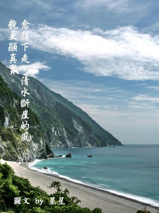 順利彎上了蘇花公路,心中牢記著花蓮當地派出所警員的指示:「經過第一個隧道後旁邊停車場即是拍攝清水斷崖景點!」,我謹慎的開車,害怕錯過了這個位置點,畢竟蘇花公路不似其他公路可以順利的迴轉呢!一停妥車我又是一陣哇的驚呼聲,真的好美耶!我終於可以如此近距離的拍到清水斷崖美景了,這可是多年來的心願呢!就這樣快門按不停,甚至還走下了旁邊往沙灘的階梯步道,好方便進一步的取景。